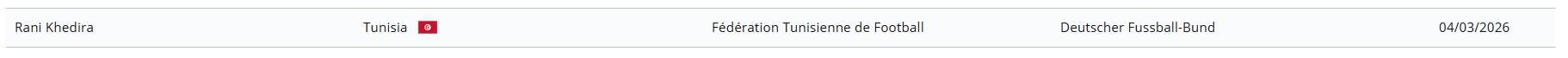 据国际足联球员会籍转会公示系统信息显示,突尼斯已经成功归化柏林联合中场拉尼-赫迪拉。